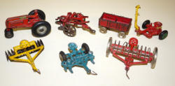 #330 - Lot of Damaged Cast Iron Toys--IH Spreader, Oliver Plow, JD Plow & Oregon Bank