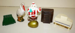 Santa is about 7" tall, the Stork is paper mache I think, all to go