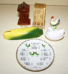 #321 - Lot of Misc Banks & Antiques--Ceramic Ear of Corn, 2 Out Houses, Covered Chicken dish & more