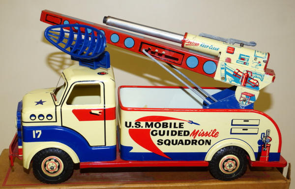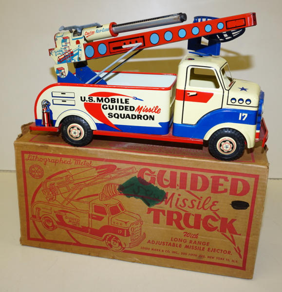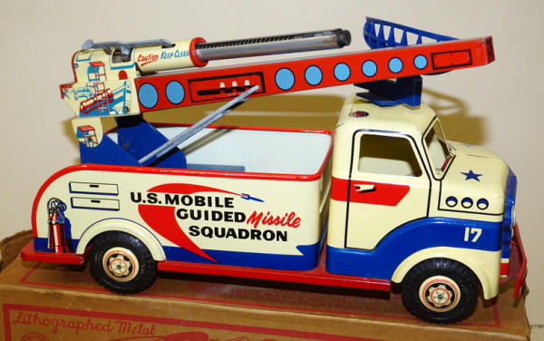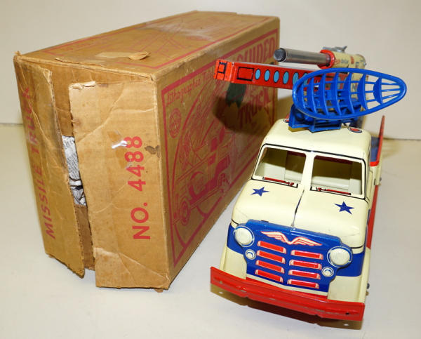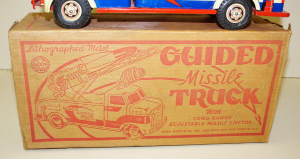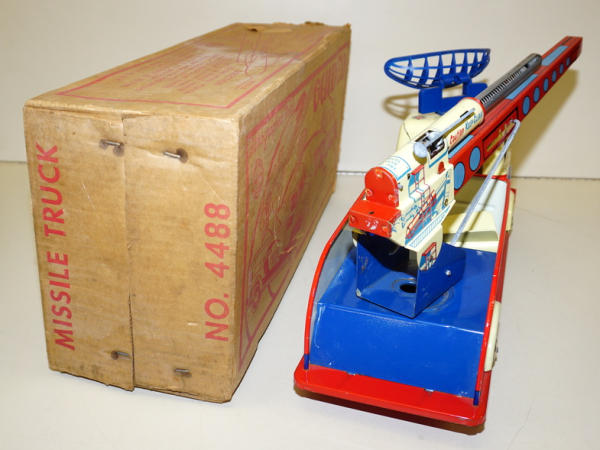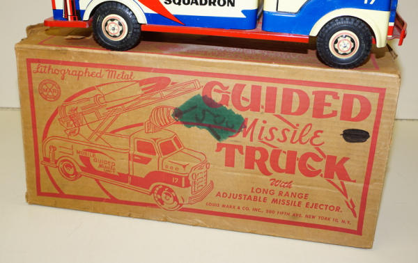 18" long, beautiful & colorful tin-litho design, a few scuffs, but overall is a 9 condition paint toy; only has the back fins for the missile, not a complete missile; Box is complete, has stains on the one side and some water stains, box rates 7 condition, no box liner