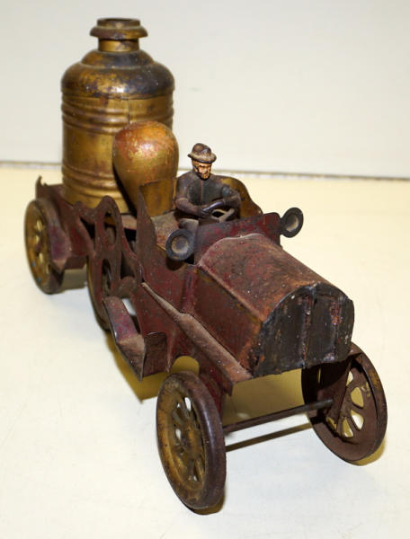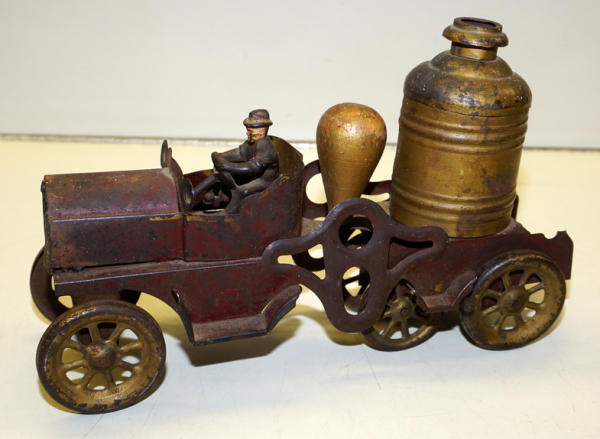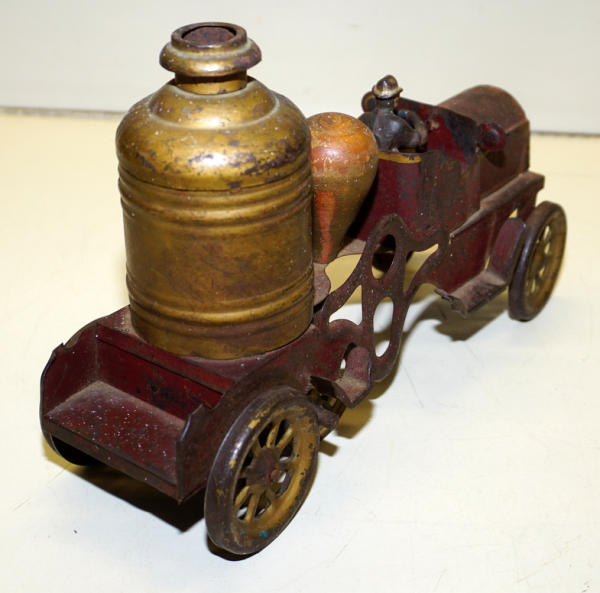 11" long, pressed Steel with cast iron driver, paint is week, grill has been poorly repaired, early toy