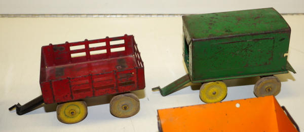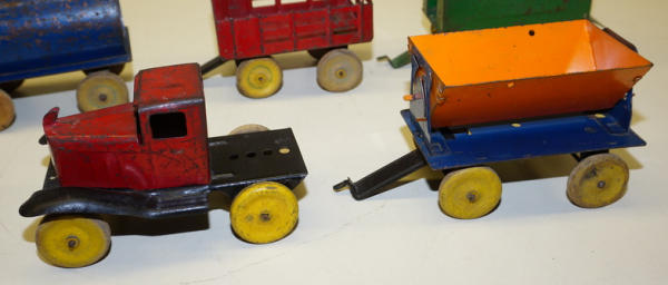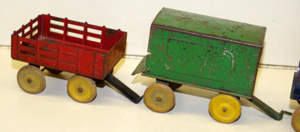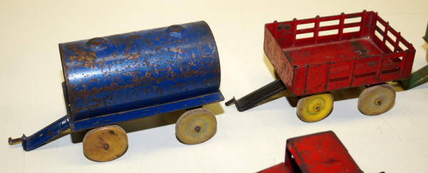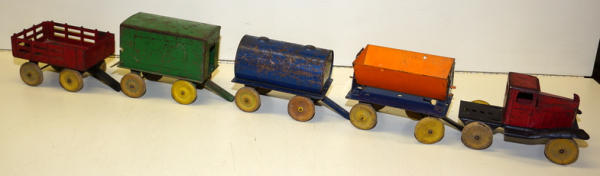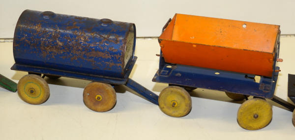 1920's Pressed Steel, all the pieces have quite a bit of play wear, rates 70% condition overall, wood wheels