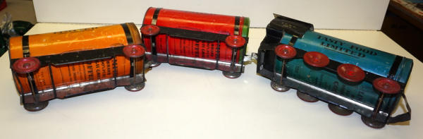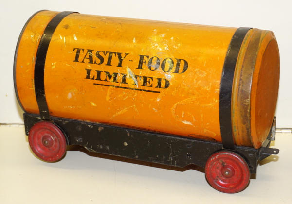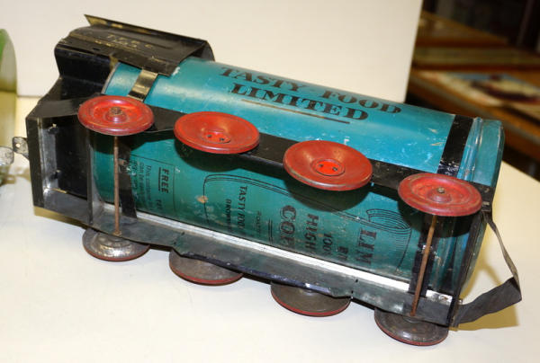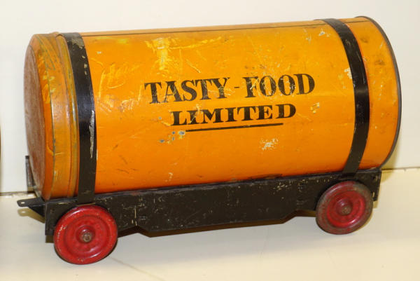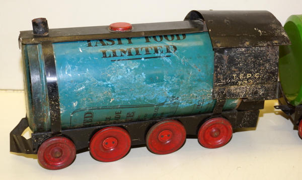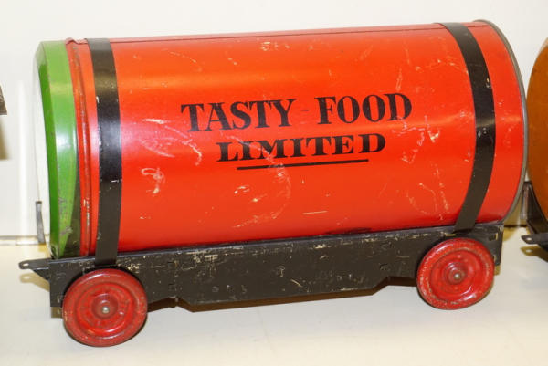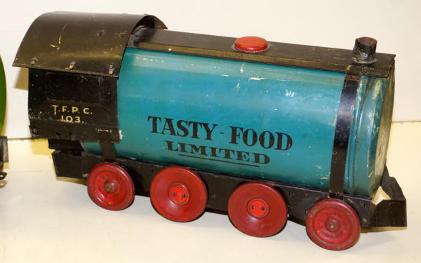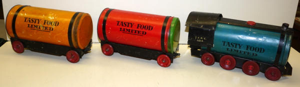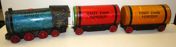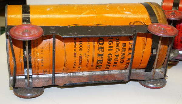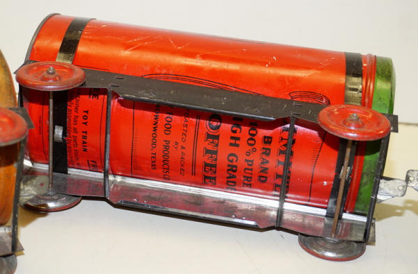really unique set, each car is made up of a real Tin-litho Coffee Can from Tasty Food Products of Brownwood, TX;, 11"x5" cans (I'd guess 5lbs", all the parts came inside the can of coffee to make the train set, neat advertising on the bottom, defiantly some scuffs and scratches, but a great patina & cross over piece for the advertising collection!