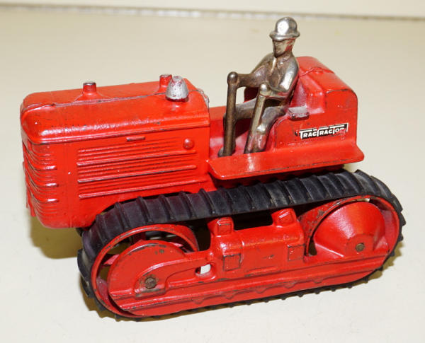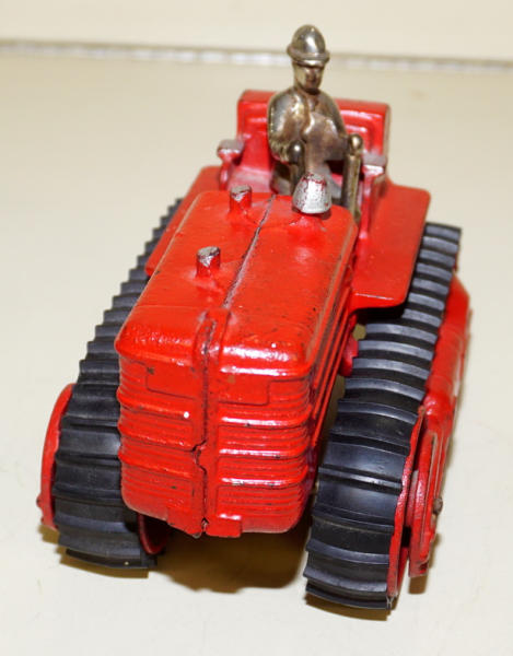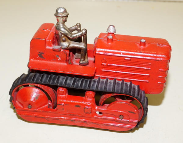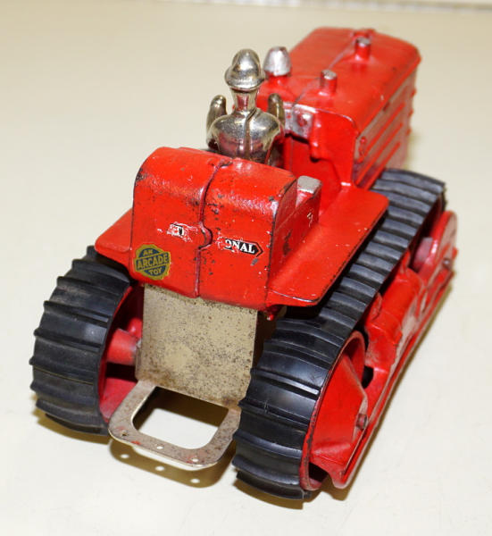7.5" long, rubber tracks are good, very nice original, nice high-lighted silver paint on the stacks, good original driver