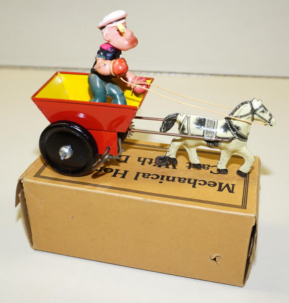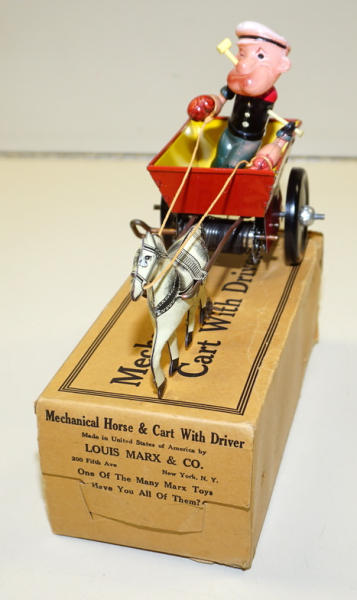 7.5" long, near mint original tin-litho horse & wagon; Popeye is lightweight Celluloid and nice shape with original pipe, box has some tears and damage to the end flaps, but complete, box rates 8 condition, rare toy in this condition