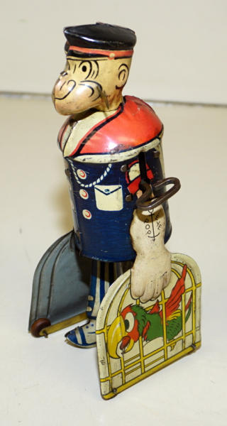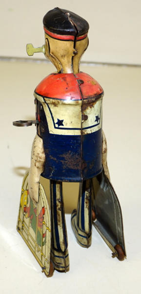 8" tall, windup works good, colors are pretty faded and has some rust spots and wear