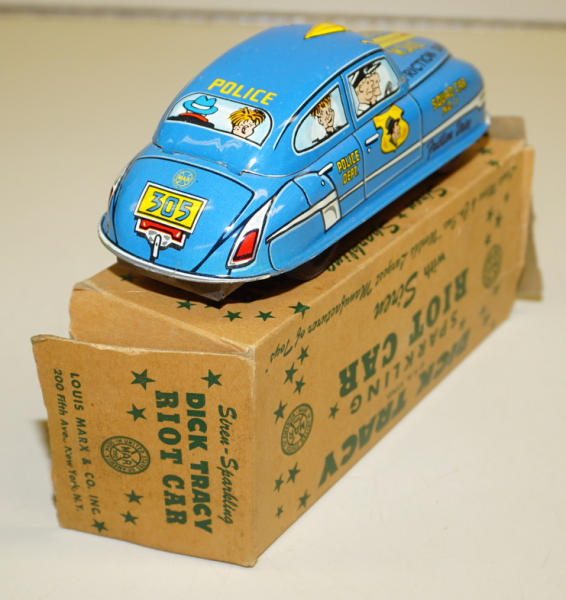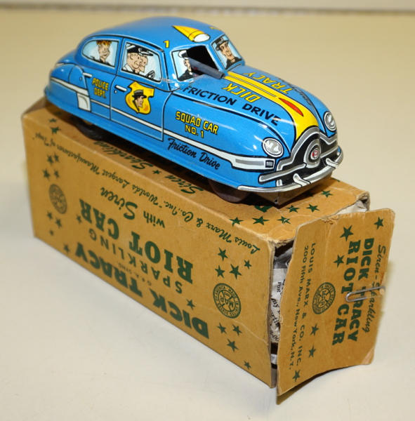 6.5" long, Friction drive, clean and near mint toy; box has end flaps torn off one end, but the are there, missing a tab on the outside flap on the other side