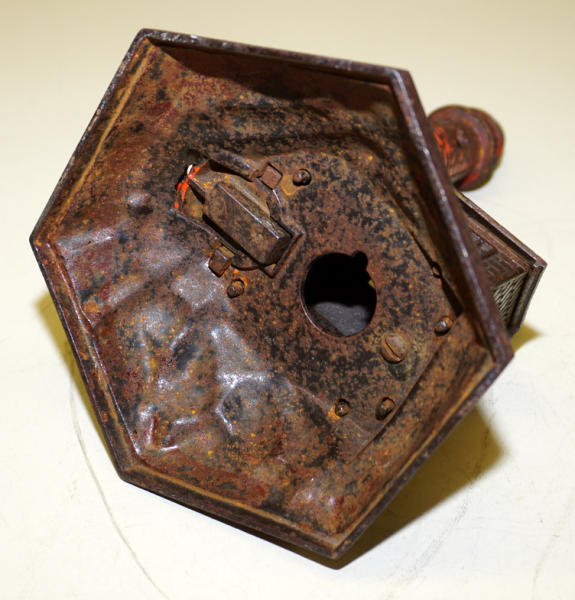 10.5" long, original paint is about 40%, I'm told this is a nickel bank, once $5 is deposited, it will open, large & impressive bank
