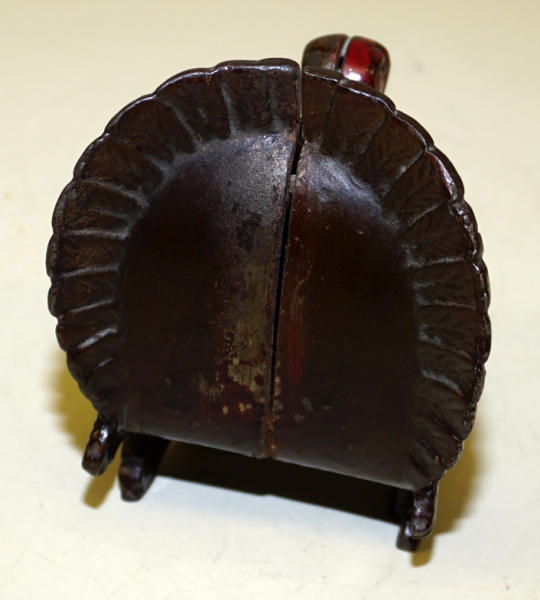 about 4.5" tall, 3.5" wide at the tail feathers, good original paint, one side is better than the other