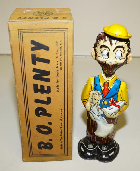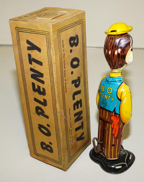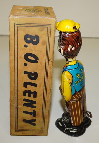 8.5" tall, windup works with some help, some light play wear, but overall nice; box has been professionally restored; some end flaps replaced and has been stiffened, nice job, but restored box