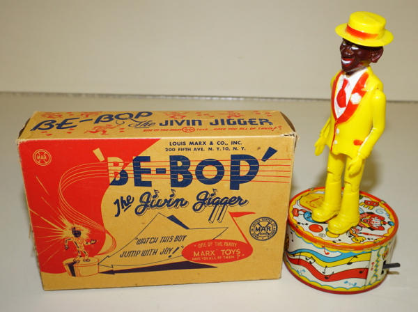 10.5" tall, near mint toy, tin-litho base, plastic figure, nice and complete box, I've never seen this toy before