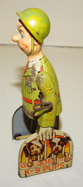 9" tall, windup works, has some large rust spots on the front and general play wear