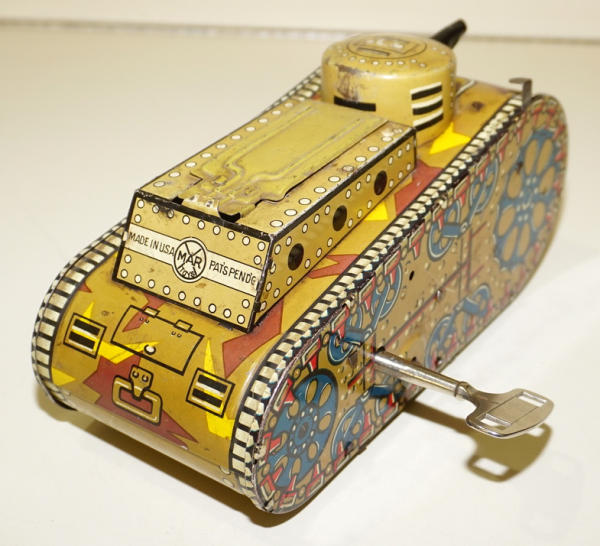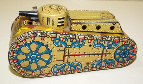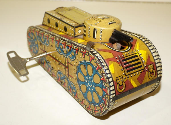 10" long, works good, I don't think it's the right wind-up key, but it works, some general play wear; has a shooter that pops up behind the turret