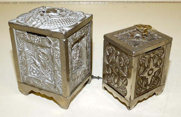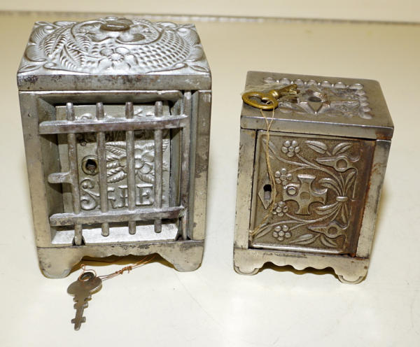 5.5" & 4" tall banks, both good originals with nice original finish, sells 2x the money