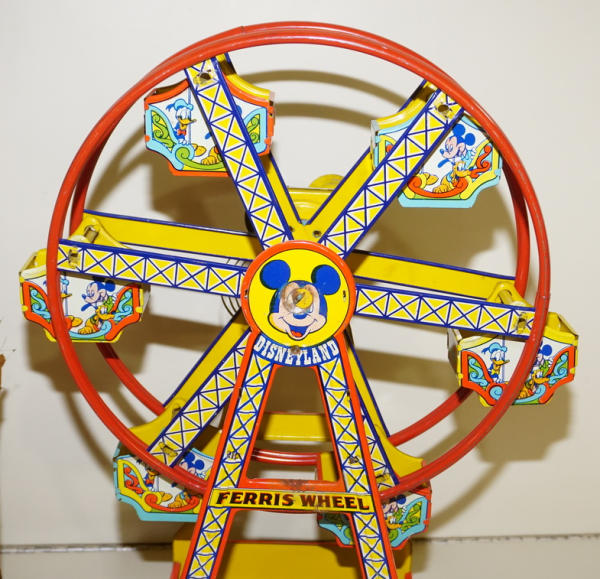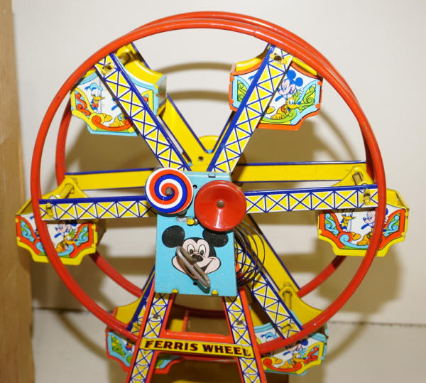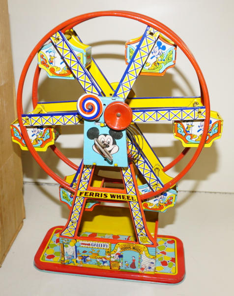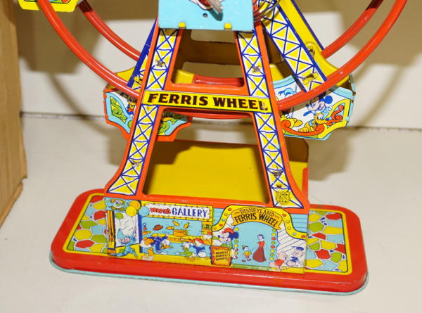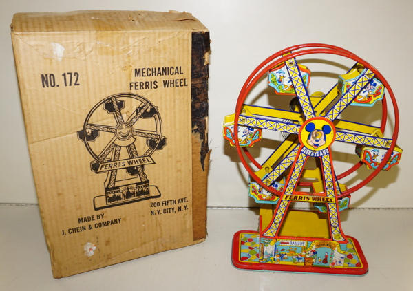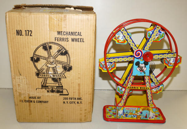 about 17" tall, windup does not work, has some light rust and general wear, Has the box, but it is for the other J.Chein Ferris wheel, not the correct one for this toy (I think)