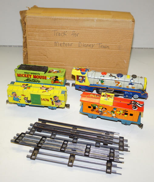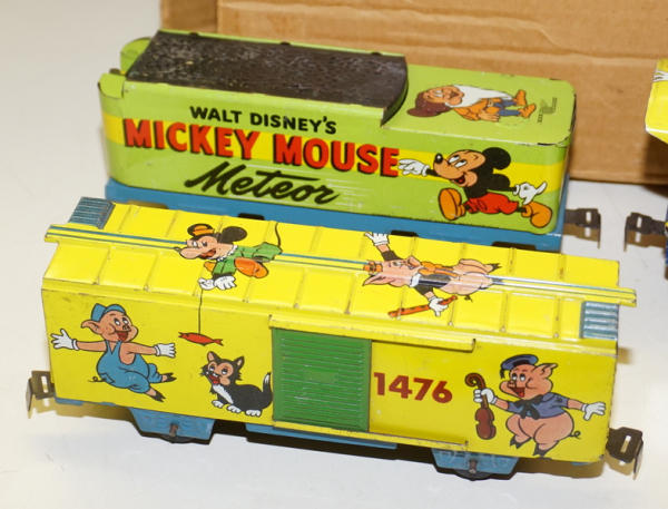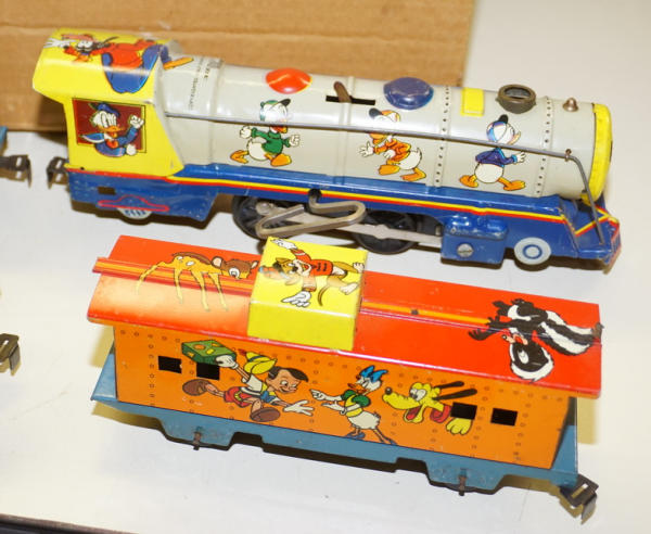 11" long engine, windup works strong, great litho cars with some light play wear, includes the track, has a brown box, but I don't think is correct for this toy, still a nice set