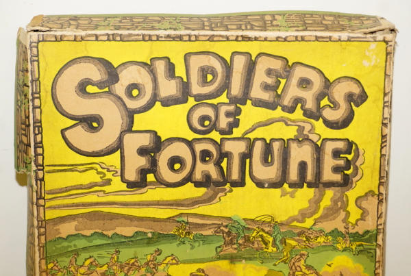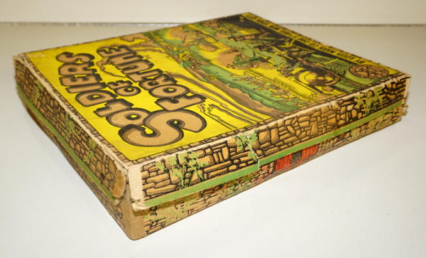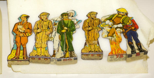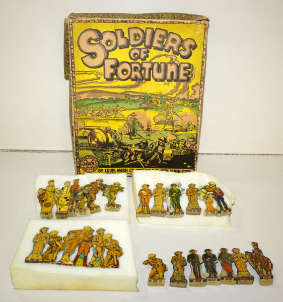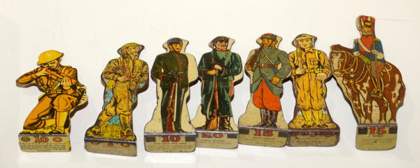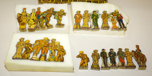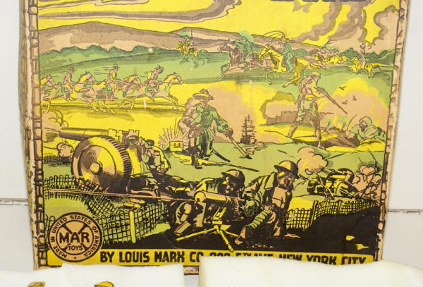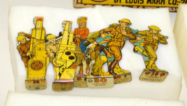 approx. 25 3.5" tall tin-litho solider targets of all different kinds, no gun or cannon, 2pc box has general wear, rates 7 condition