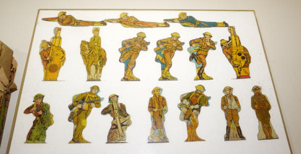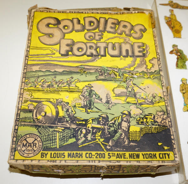 30 3.5" tall tin litho solider targets, all WWI style soldiers, nicely displayed in a plastic case, comes with an original Marx box, but box has heavy tape on the corners and damaged corners