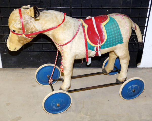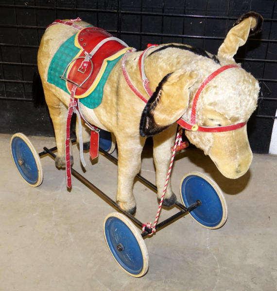 about 3' long, 28" tall, pretty good original with the original saddle, the ear button is not attached but included, large & impressive piece for the Steiff or ride-on collection!