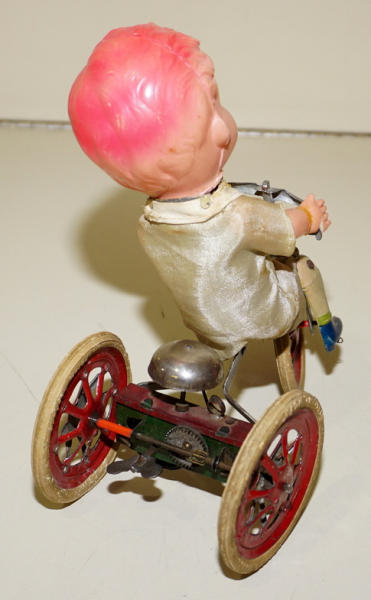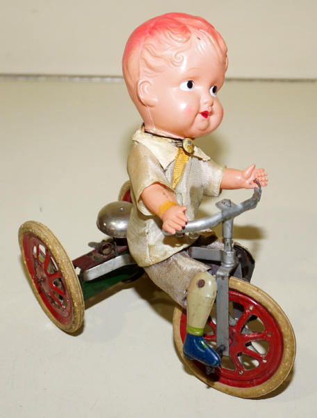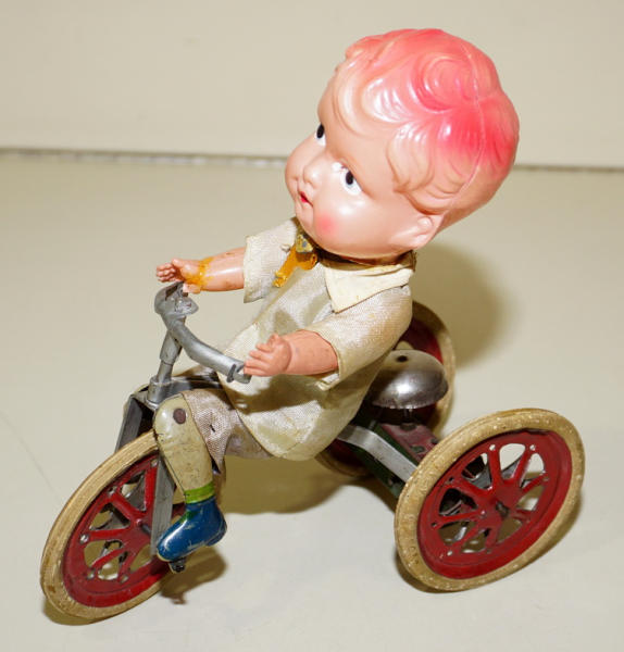 about 8.5" tall, works, not sure on the maker, tires are marked "Made in Japan", Celluloid head and arms, one had is damaged, otherwise some general play wear