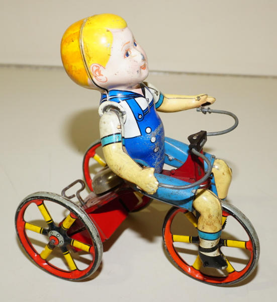 about 9" tall, this one does not have a maker's mark, this one has Blue overalls and spoke wheels, windup does not work, some general wear, and fading
