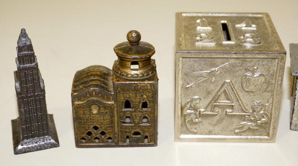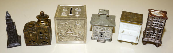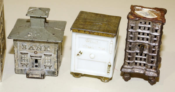 largest is 3" tall, white one is Milk glass, one small building is pot metal, all to go