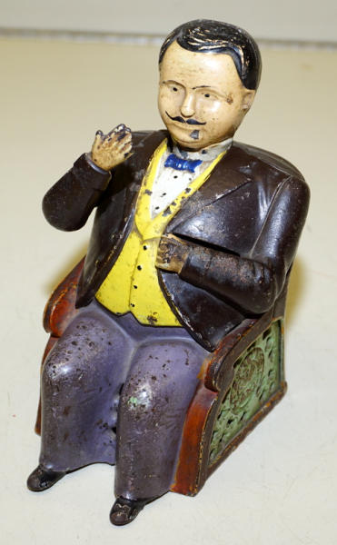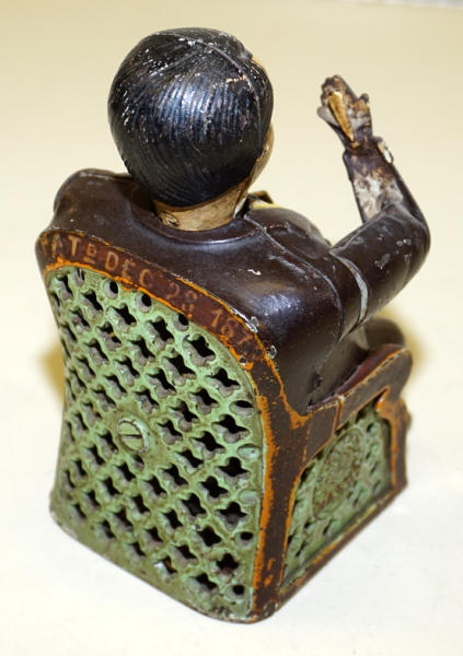5 3/4" tall, 4.5" deep, 3" wide, pat'd date Dec 23, 1873 on the back, very good original paint, place a penny in his hand and he pockets the money with a quick nod of the head, overall a very good original paint Mechanical bank