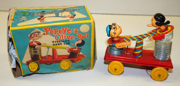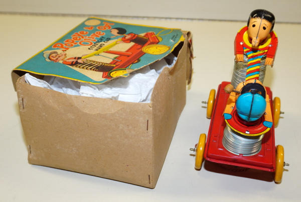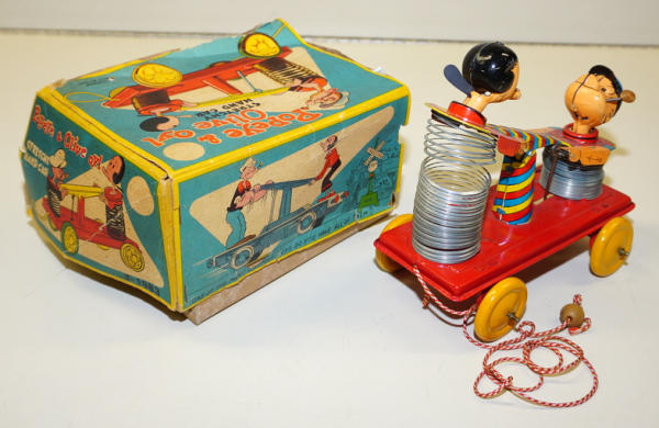7" long, really clean and near mint original toy with original pull string and the wood bead on the string; 2pc box is missing 2 side panels and has general wear, a very rare box worth having professionally restored
