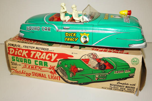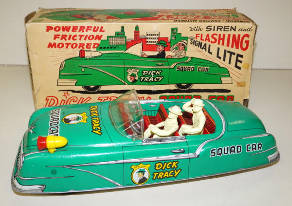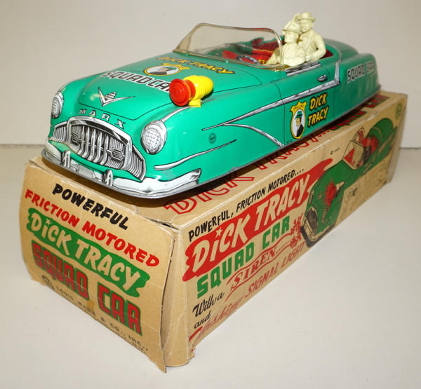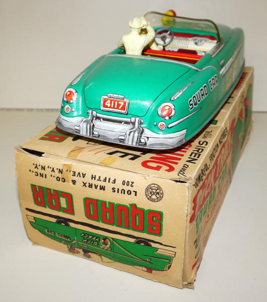 20" long! Large & impressive toy, Friction drive with battery op. lights & siren; battery box is clean, did not test; has the 2 original figures; bright colors, but some crazing/oxidation happing to the paint, mainly on the truck side, box is complete, but has general wear to the edges and end flaps, great color on the box; box rates 8 condition, awesome piece!