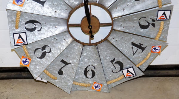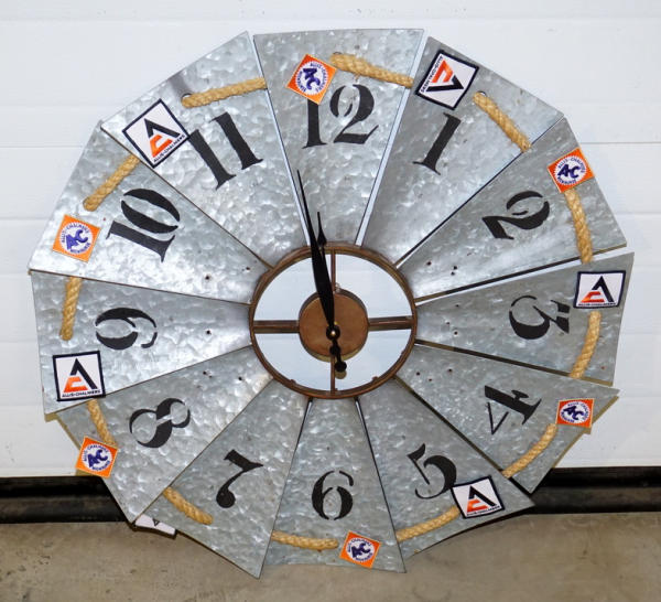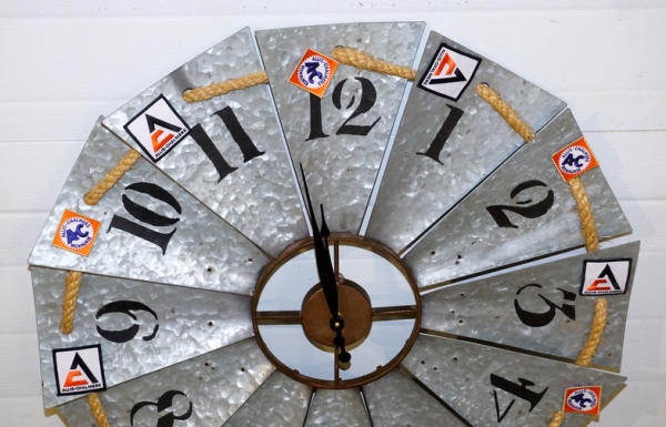 28" across, new decorative Windmill clock with various AC patches attached, has been displayed, needs cleaning