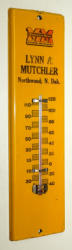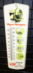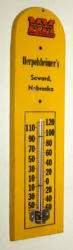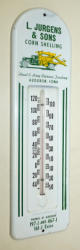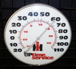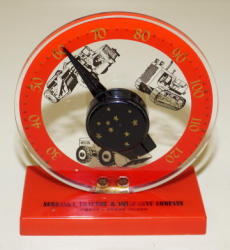 6" across, some paint flaking on the edges, but a unique looking thermometer