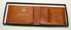 neat set, the bottom of the coasters has the IH Crawler graphic stamped into leather, from Nebraska Tractor & Equipment Co; box has some age spots, but overall very nice