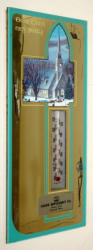 #367 - JD QFE Logo Mirror-Thermometer w/ Church Scene--Pennock, MN