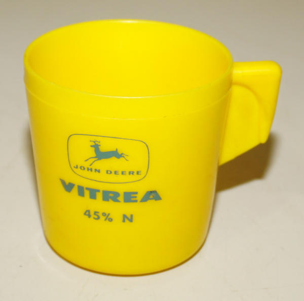 3.25" tall, about the size of a small coffee cup, some light wear, but a really hard piece of JD Fertilizer Advertising to find!