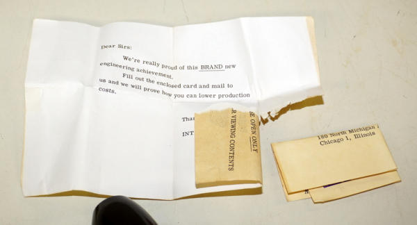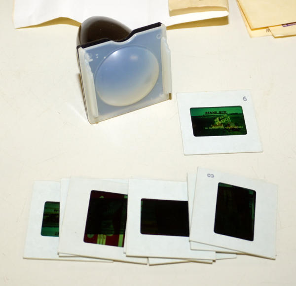3" long slide viewer, 9 original slides showing looks like early 1960's equipment like a 560 pulling a chopper, includes the original box and the card sent to dealers, really interesting piece