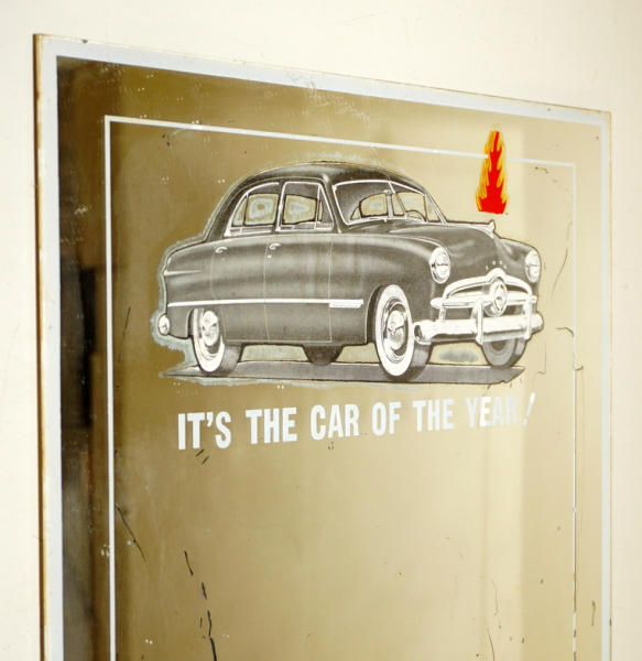 22"x12", bottom left corner is chipped, has age spots in the mirror and color is faded out of the car