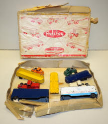 Toys are played with, rate from 95% to 85%; the Road grader has the most wear and paint loss to the blade, no box liner, box is square, some age spots and writing, overall box rates 8 condition