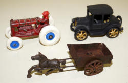 #796 - Lot of misc. Cast Iron--Repaired Fordson, Small Cast Horse w/ Tin Cart & Reproduction Car