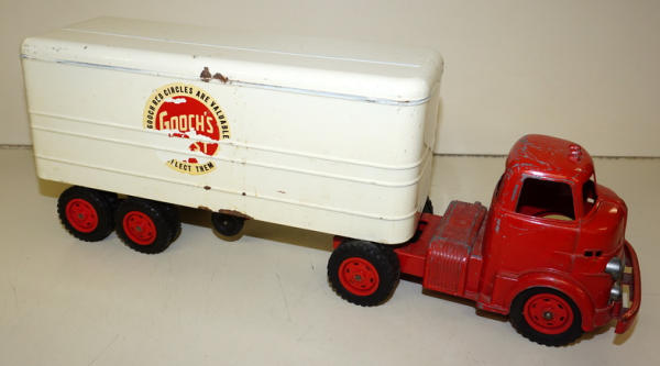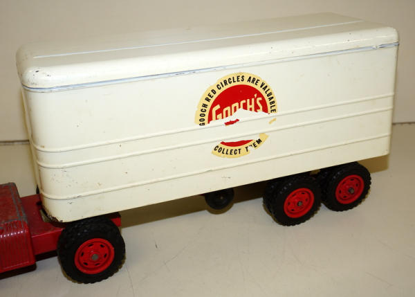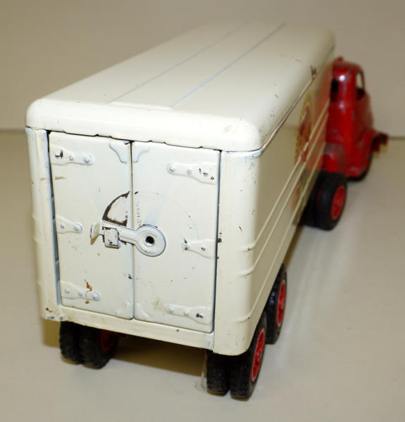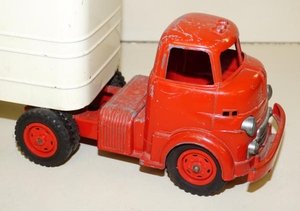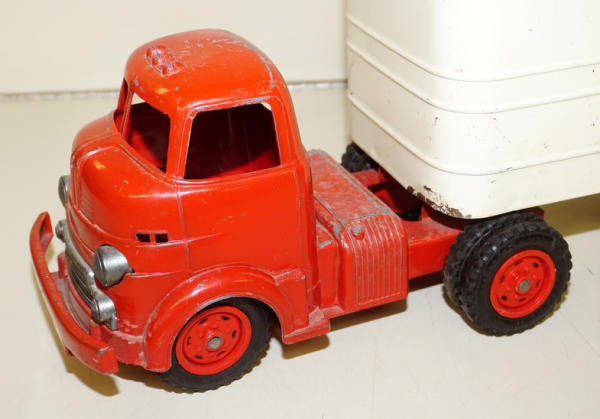 Diecast cab & steel trailer, paint on the cab is about 80%, paint on the trailer is about 85%, but the decals on both sides have quite abet of flaking