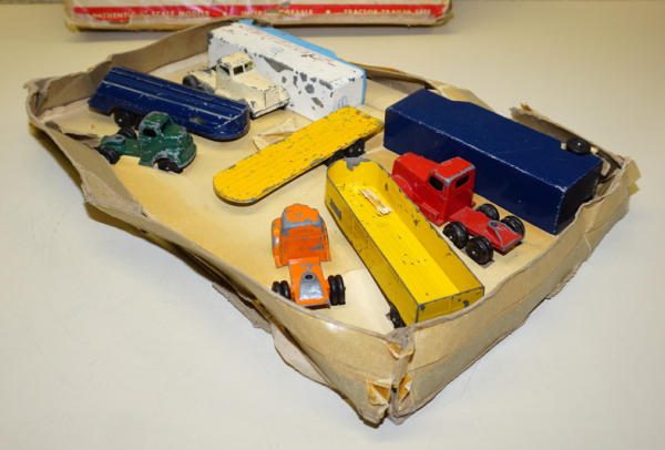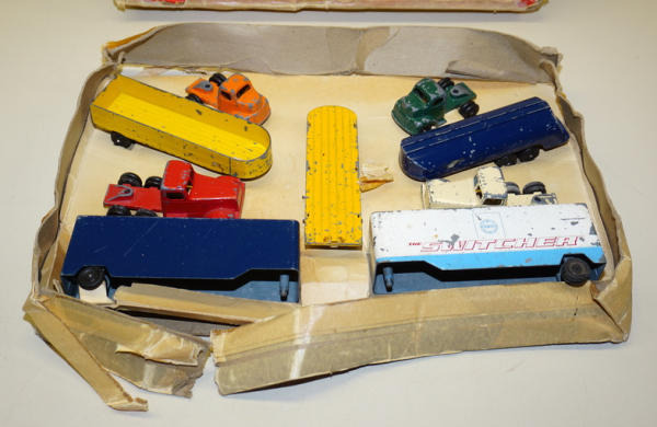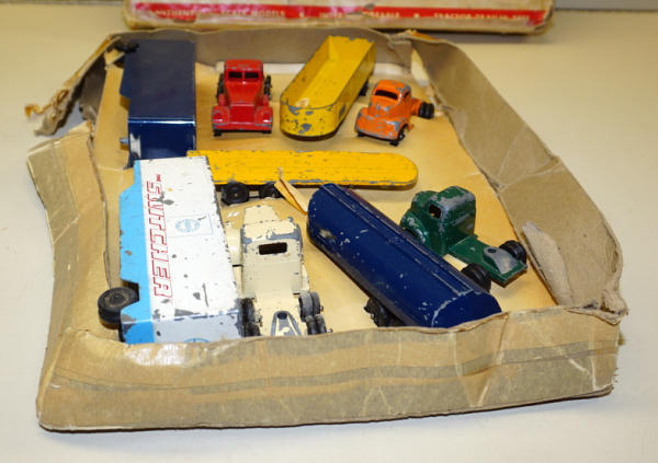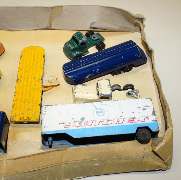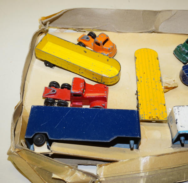 Toys are about 1/64th scale, all have quite abet of play wear, box is very rough to poor condition, but included