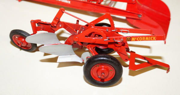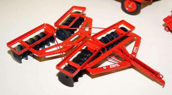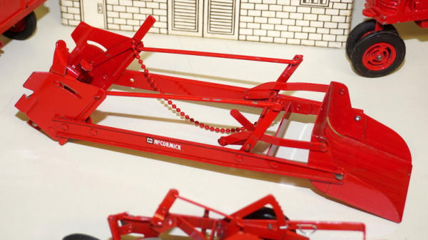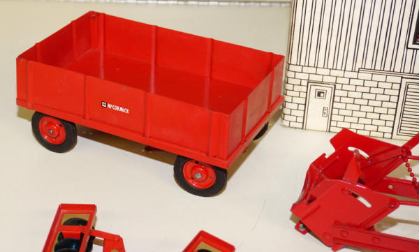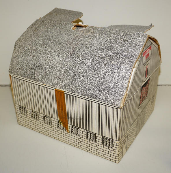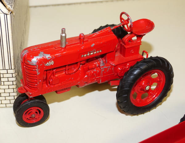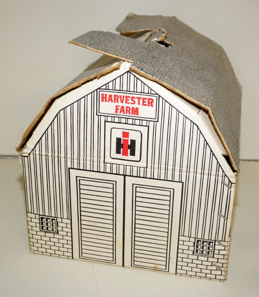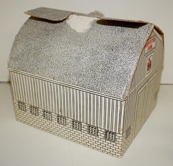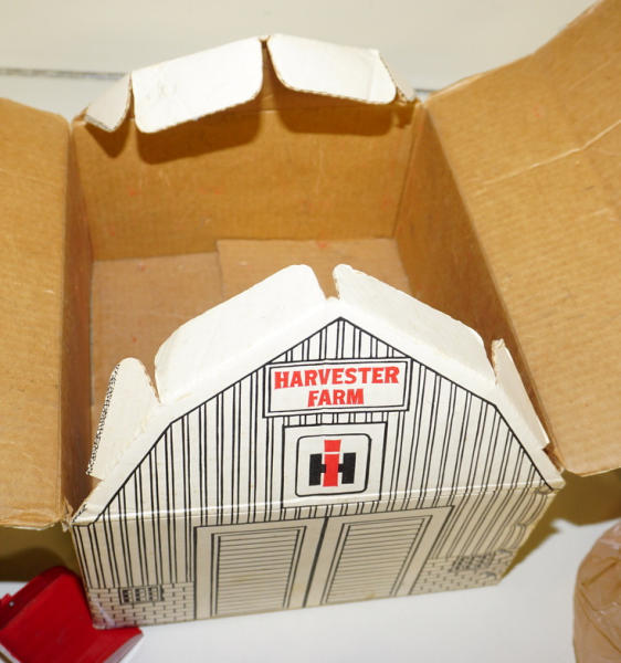 One of the highlights of the day! Tractor is about 90% condition, implements are all about 95% to near mint condition; Barn box is bright white color and solid; no dividers in the box; one roof panel has a pretty large spot of tape burn, overall I'd rate the box at an 8 condition, great set!