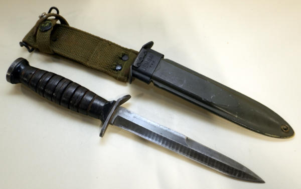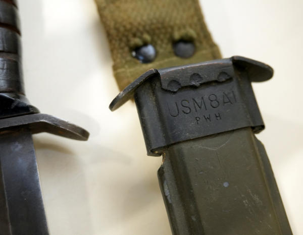 knife has stacked leather handle, no markings, 6.5" blade, very nice condition; sheath has good frog, sheath marked "USM8A1 PWH"; nice shape