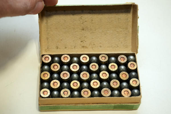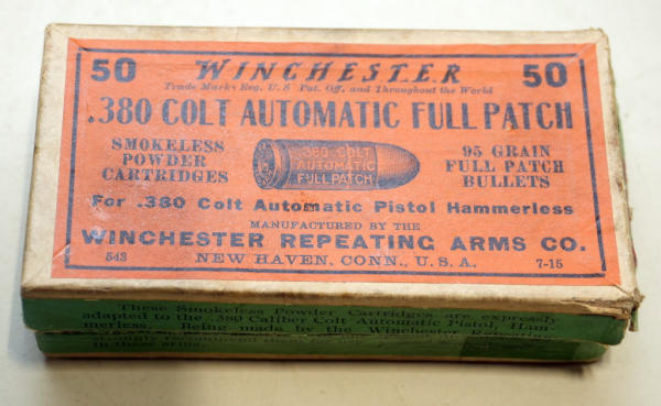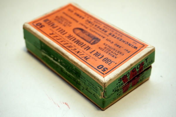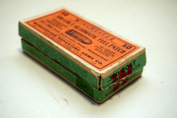 has label date code of July 1915; nice box overall, has minor wear and split corners; full 50 rounds; Has writing on the bottom and some cellophane tape, the back long side is still sealed