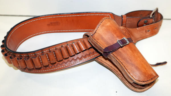 no marking on holster; nice used condition; no size marking; belt is about 44" long