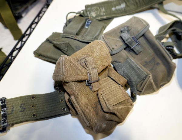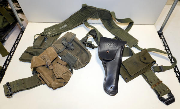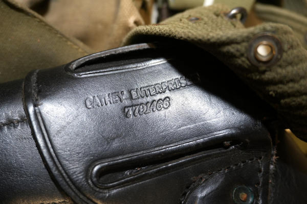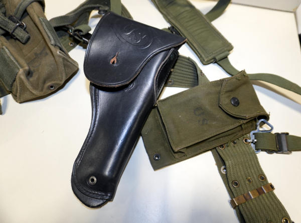includes a non-dated leather holster and several magazine & ammo pouches; on backpack style harness & belt; nice original