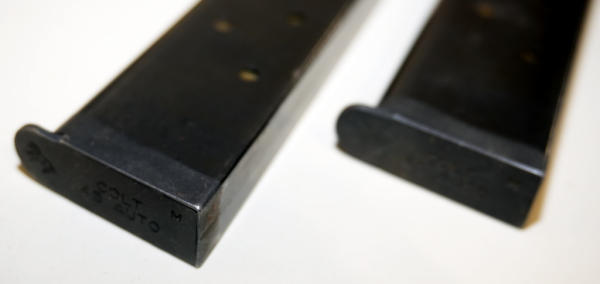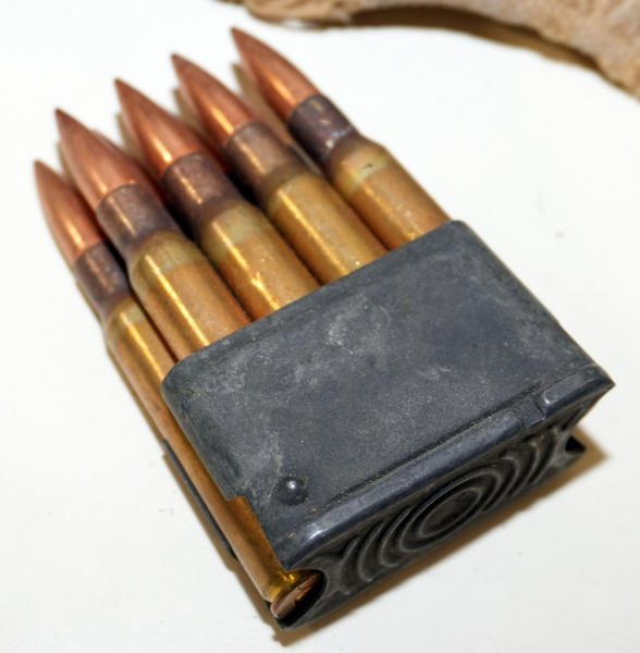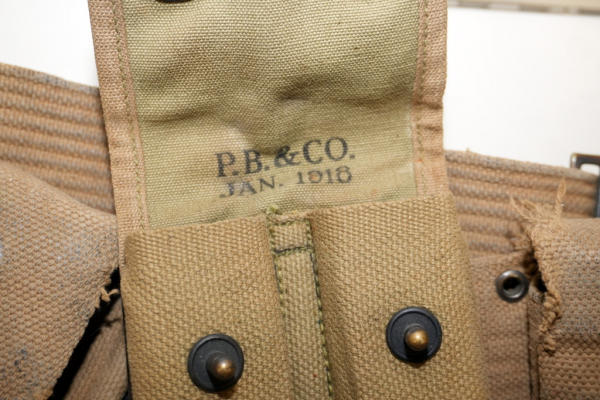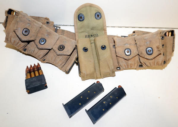 9 clips w/8-rounds each for 72 rounds of .30-06; has a magazine pouch marked P.B. & Co. Jan. 1918 w/two 1911 magazine w/45 ACP; magazines are both marked Colt 45 Auto on bottom; nice originals