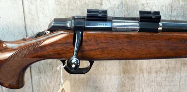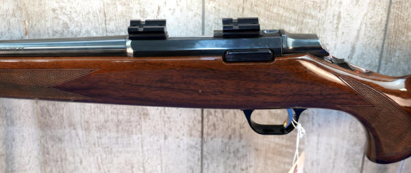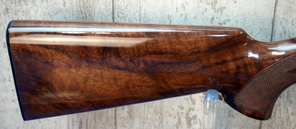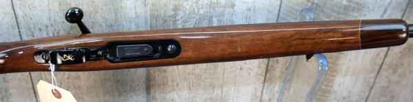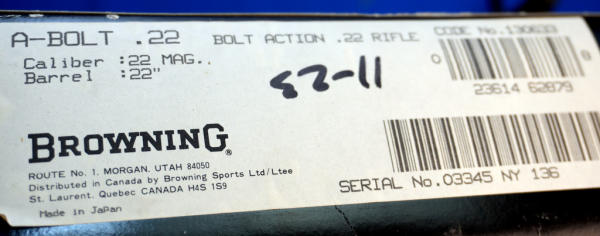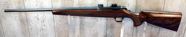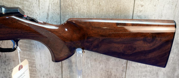 22" BBL; mint & unfired w/factory box; wood stock w/checkering; plastic butt plate; removable magazine; gold trigger; scope blocks; high gloss finish; Japan; SN#03345NY136; A-356