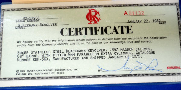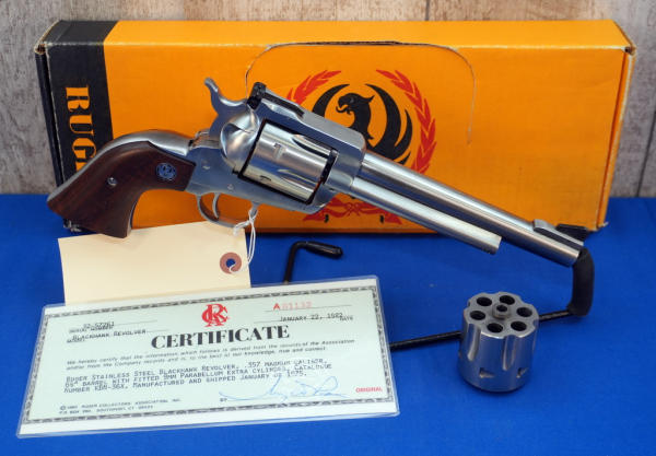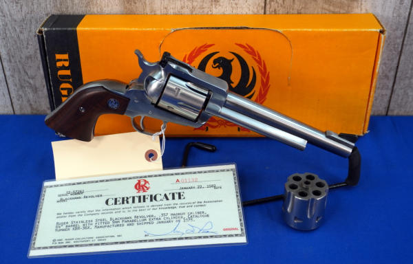 this comes w/a COA verifying that is came w/both cylinders and mfg. in Jan. of 1957; 6.5" Barrel; wood grips w/silver eagle logo; factory box but does not have the end label; looks near mint & very little use; USA; SN#32-57261; A-356