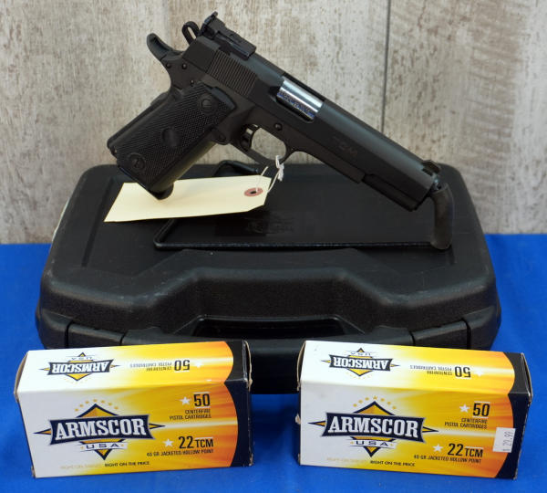 5" BBL; plastic checkered grips; clean and like new condition; factory hard case; includes 100 rounds of Armscor 40gr. JHP ammo; Philippines; SN#TCM005530; A-366