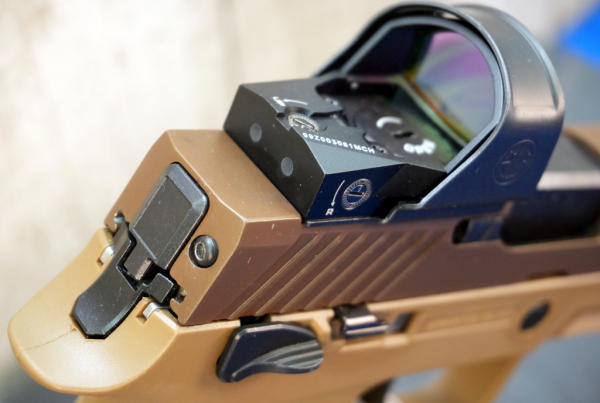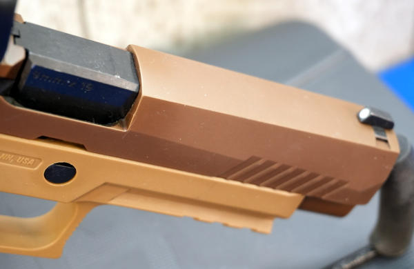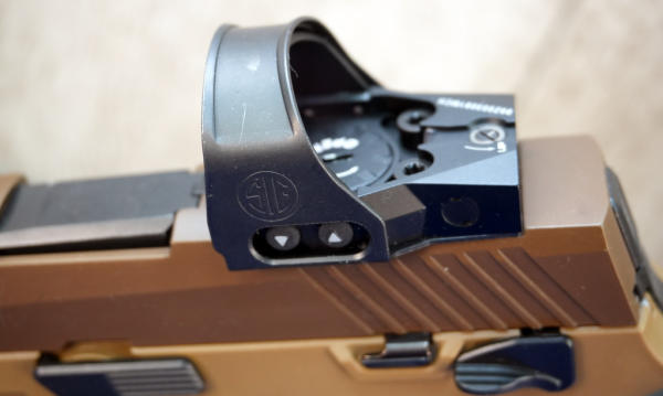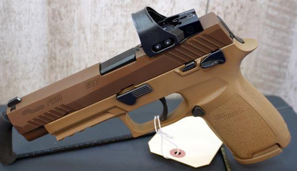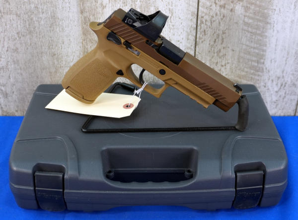 4.5" BBL; brown synthetic frame w/steel slide; front night sight; SIG red dot sight; factory case w/3-magazines; Like New; USA; SN#M17-168597; A-373